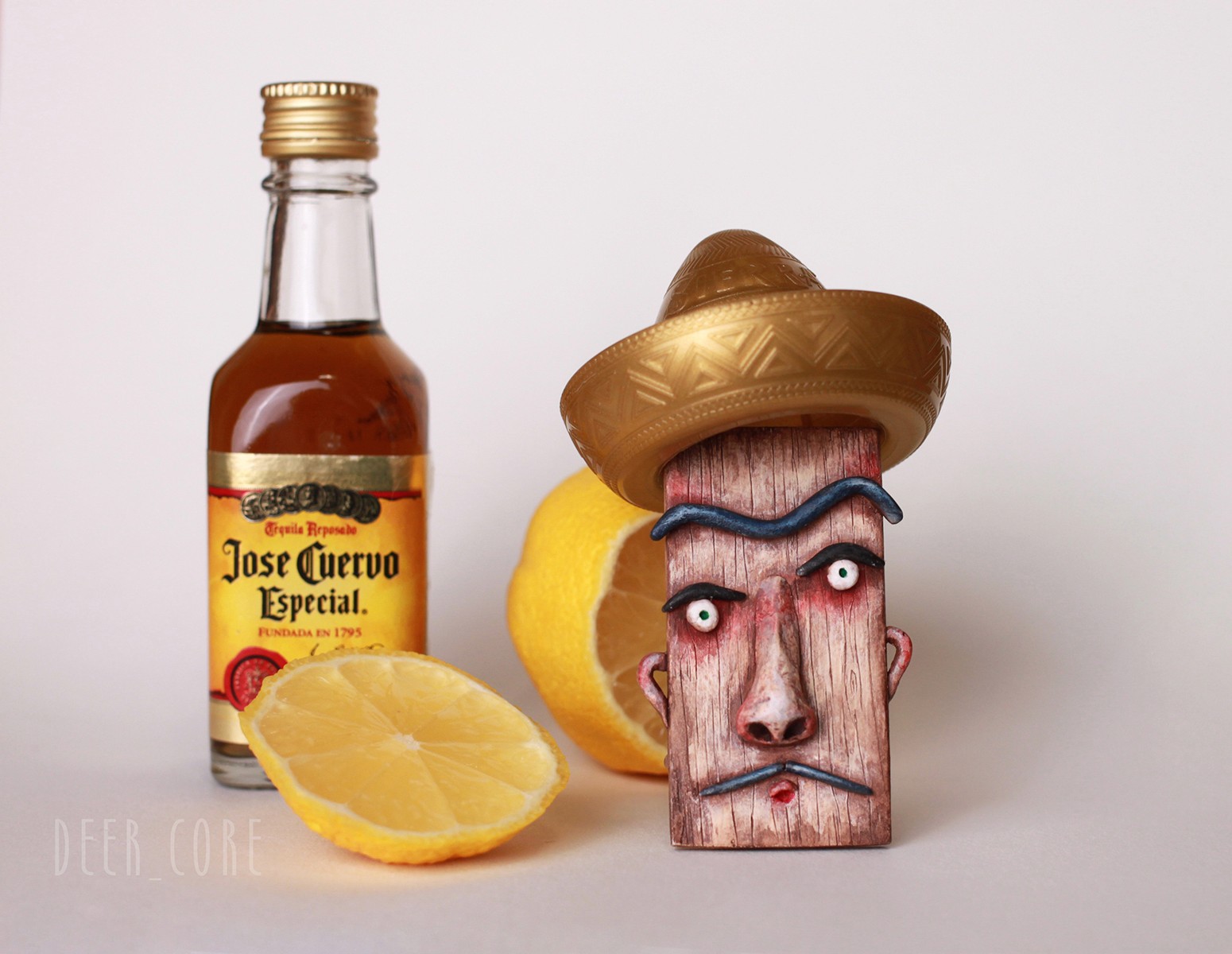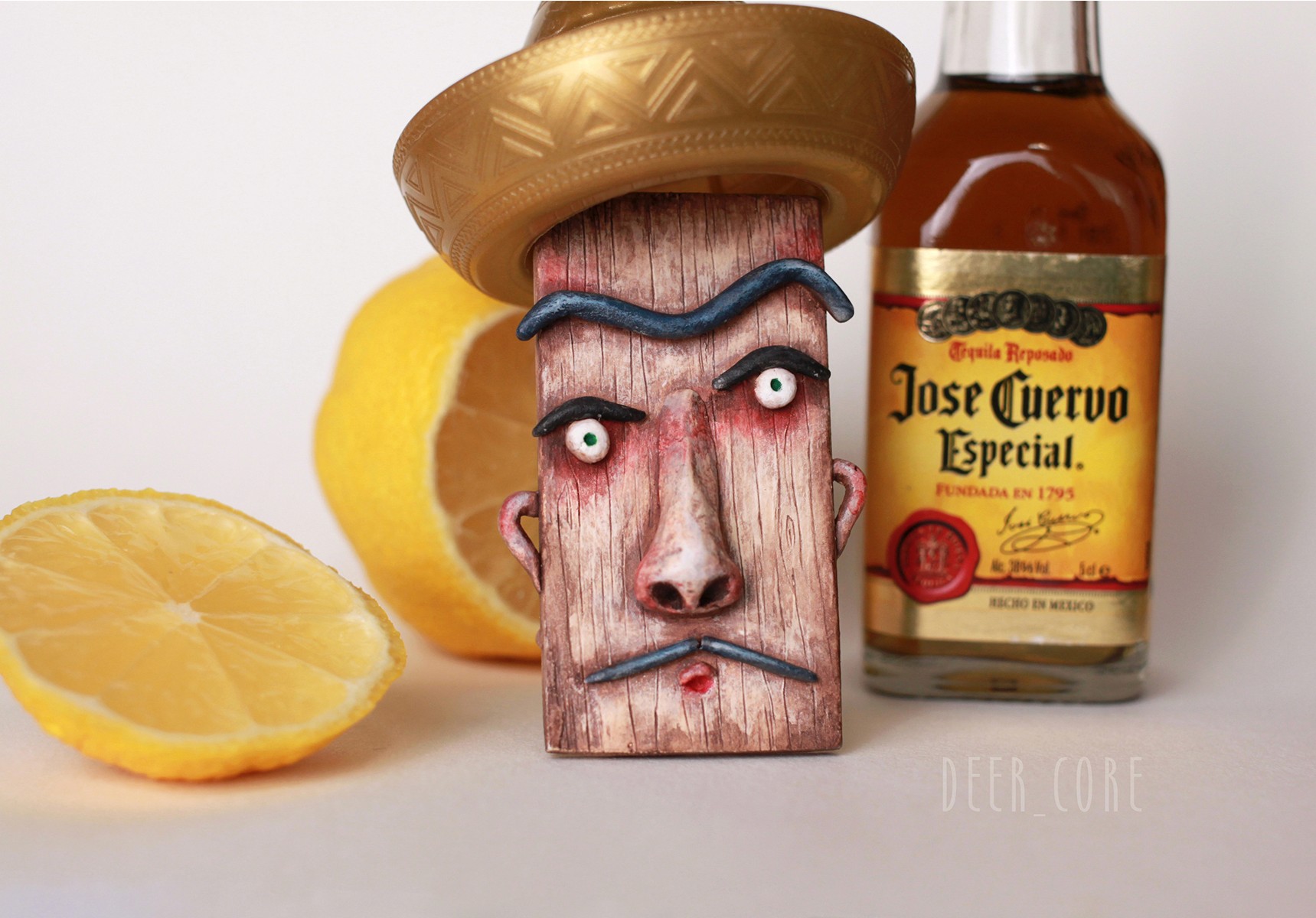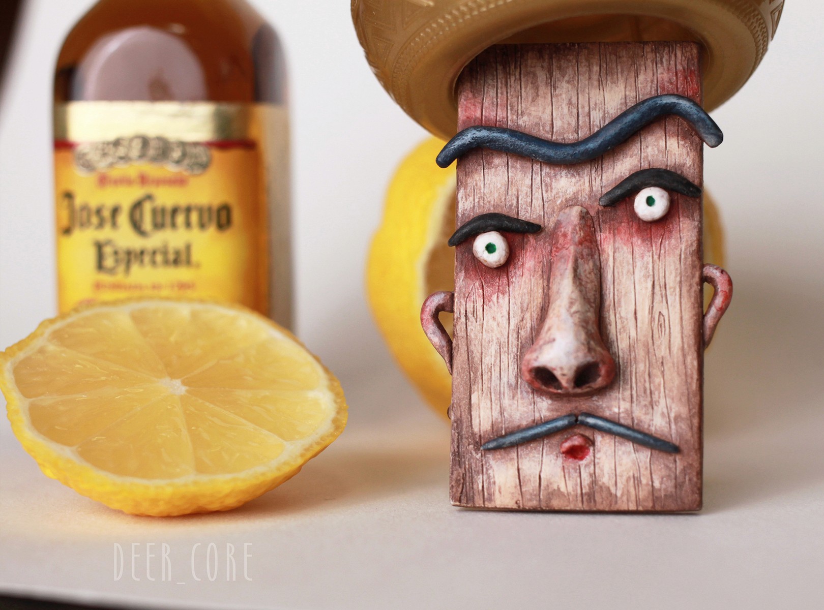 Wooden base, air drying clay, acrylic paints, varnish, safety metal clasp
