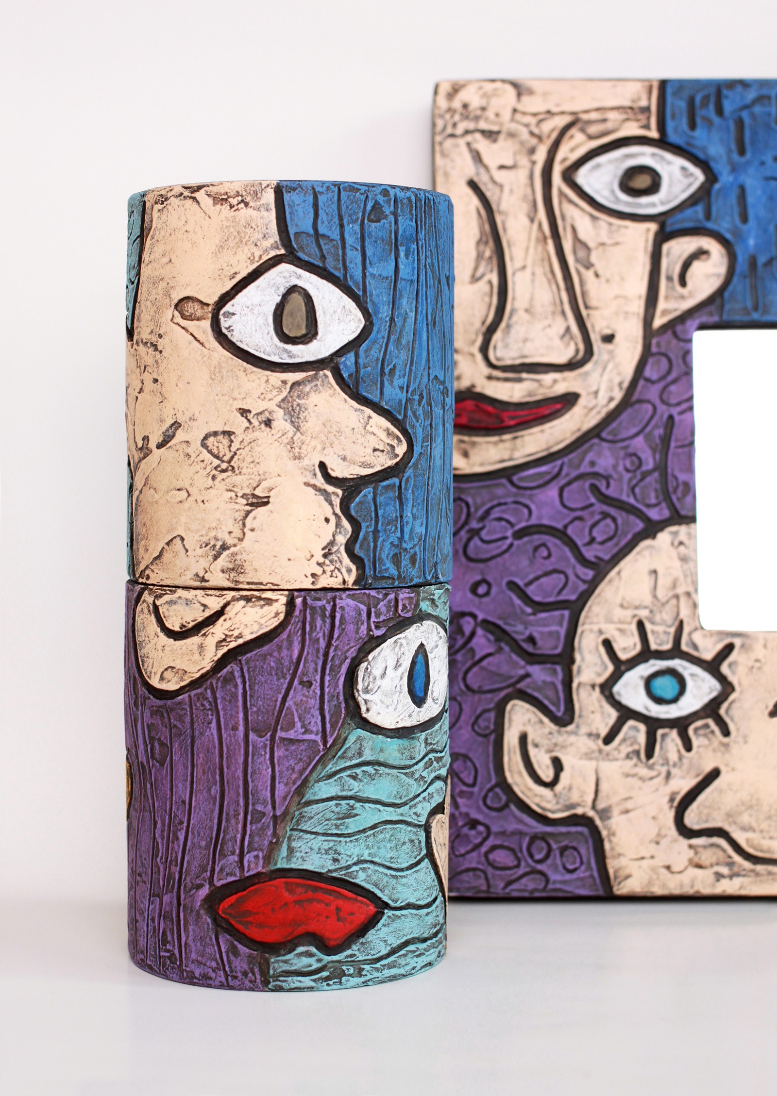 Chipboard base, hand cut mirror, cylindrical cardboard base, structural paste, acrylic paints, varnish.