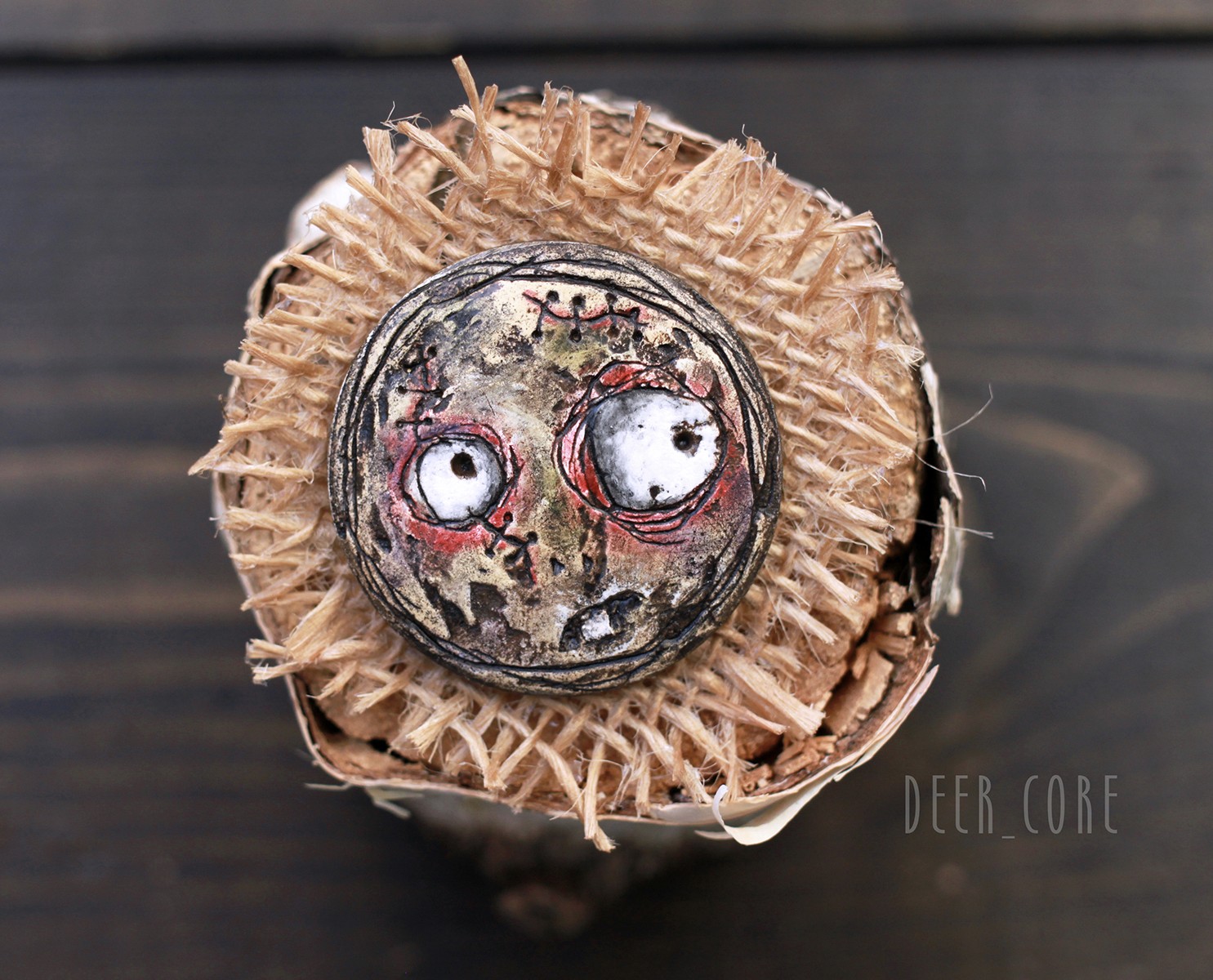 Wooden base, structural paste (plaster), acrylic paints, varnish, hard bagging, safety metal clasp