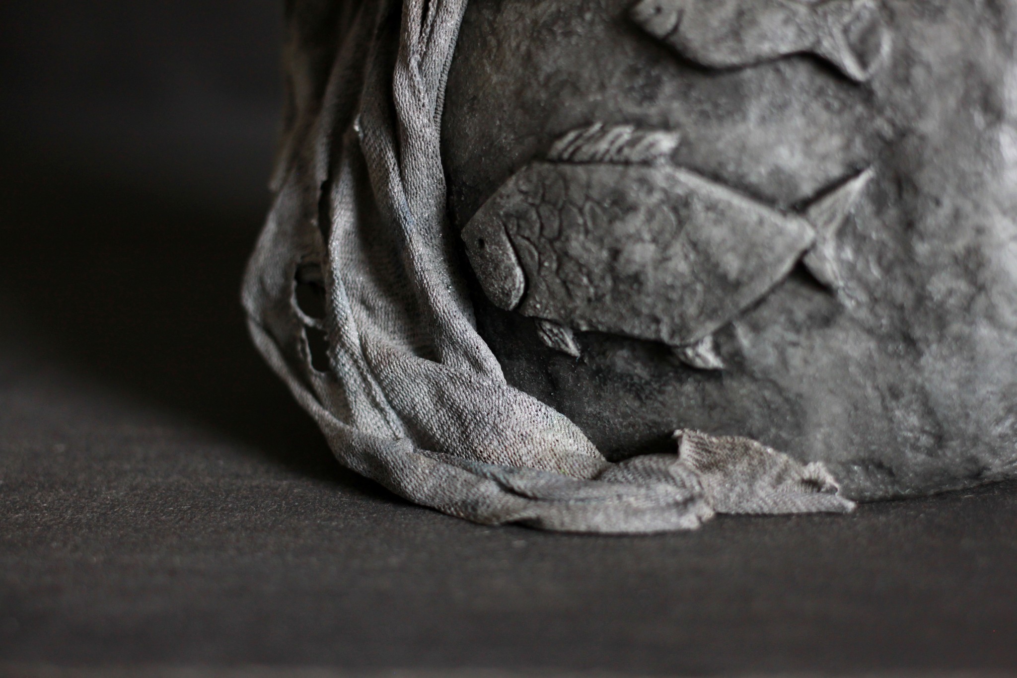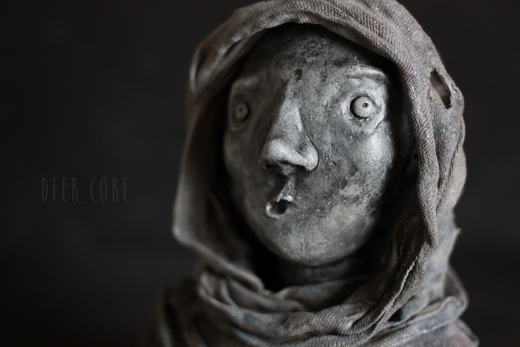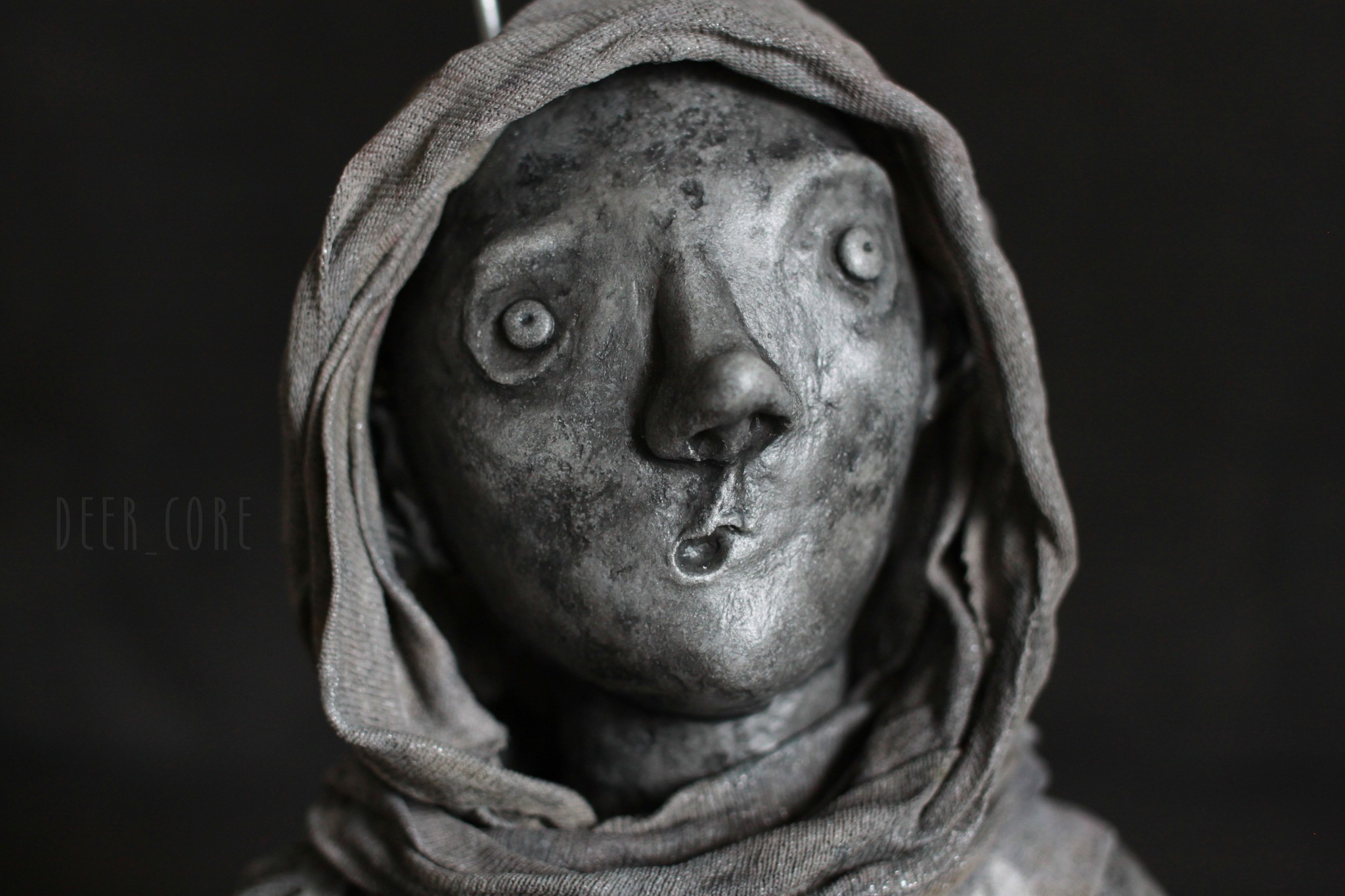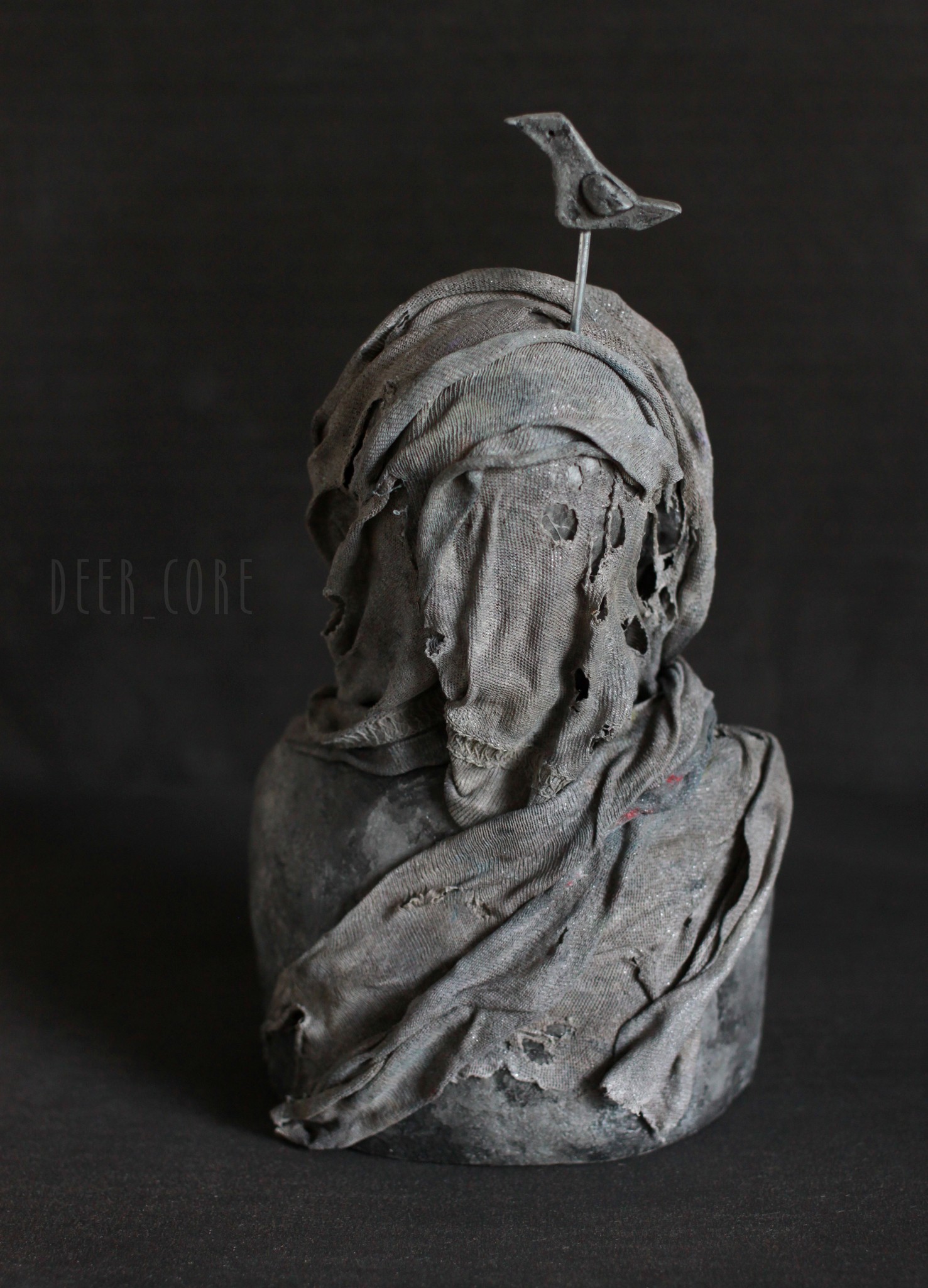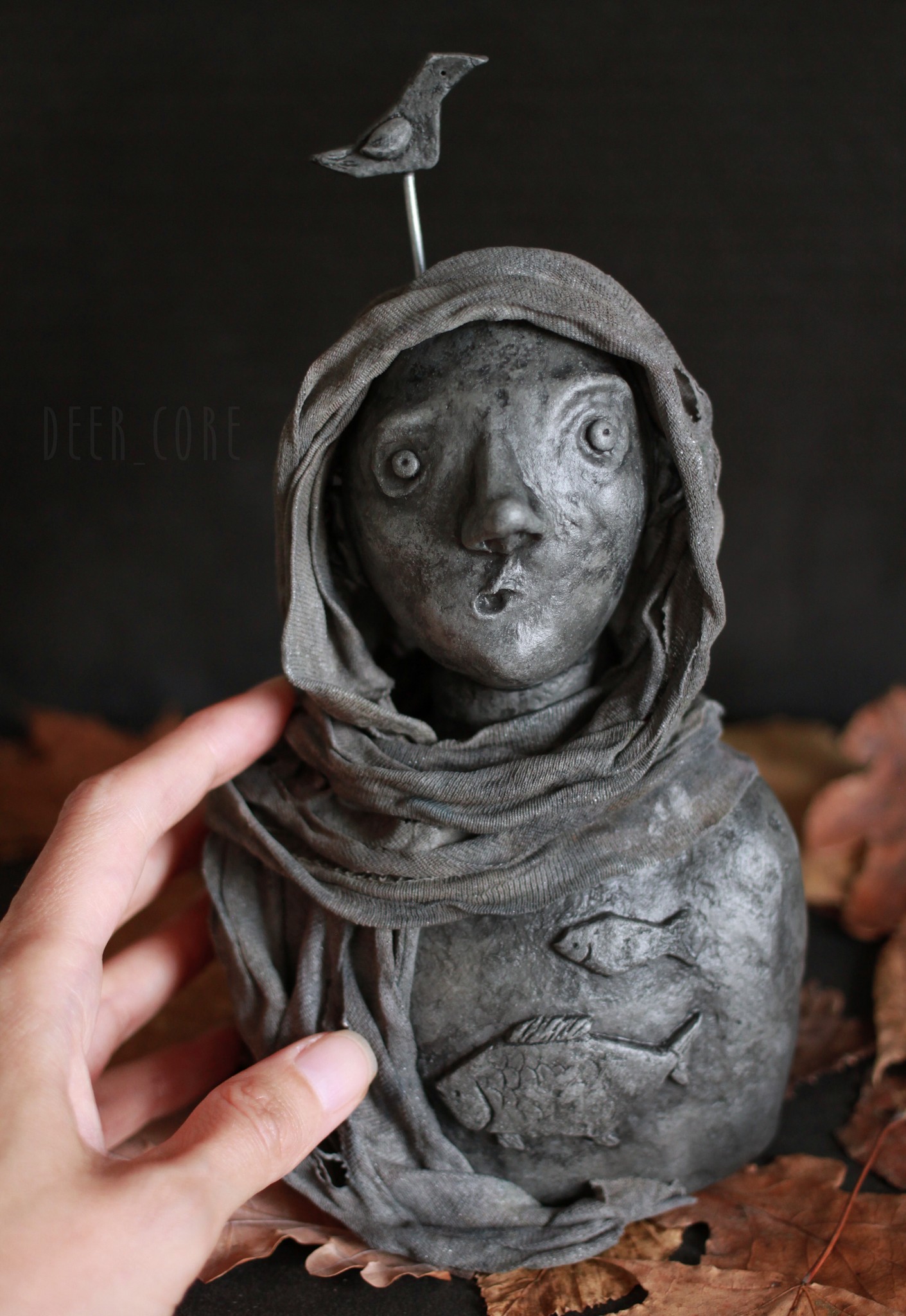 papier-mâché, acrylic paints, air drying clay, textile, metal wire