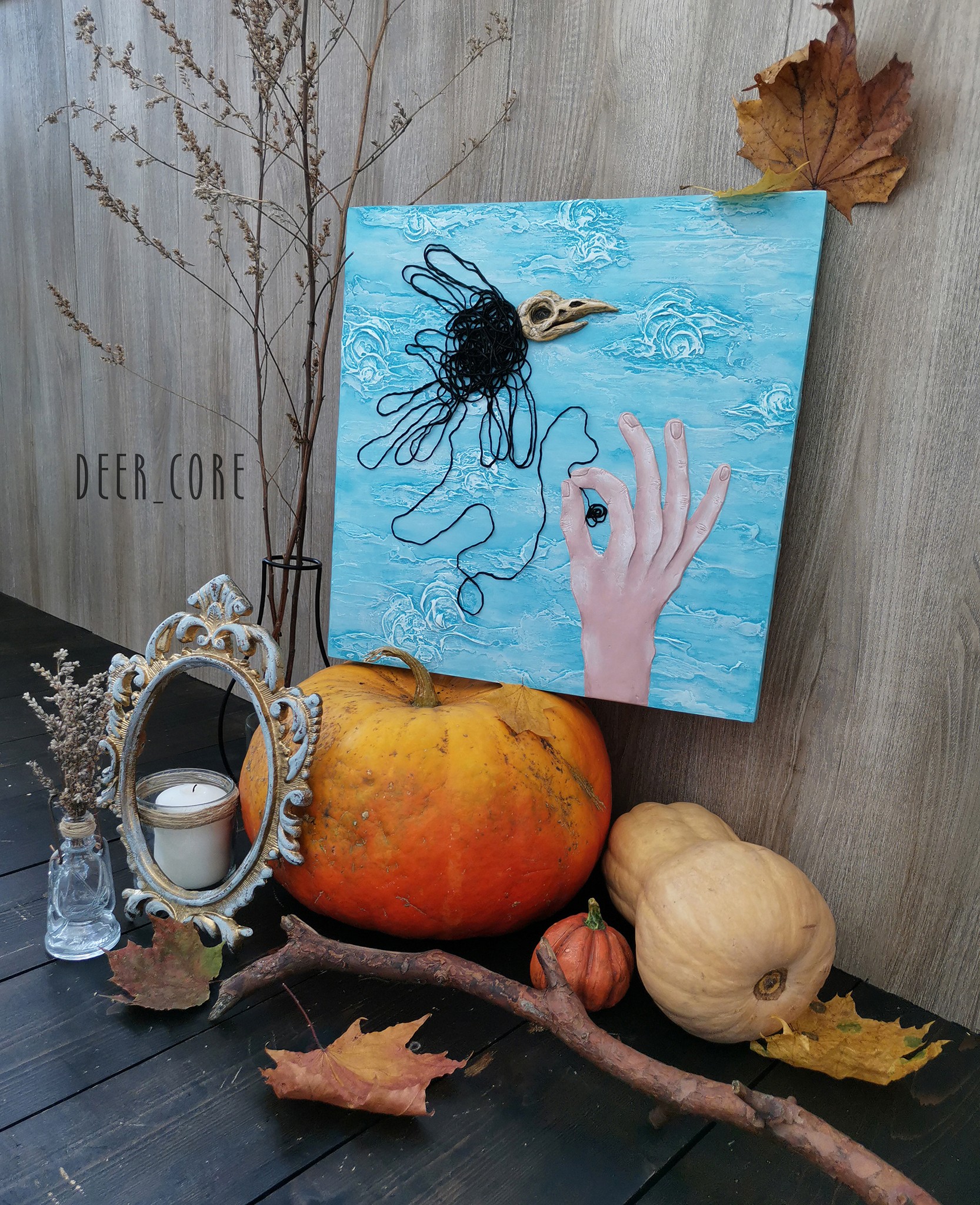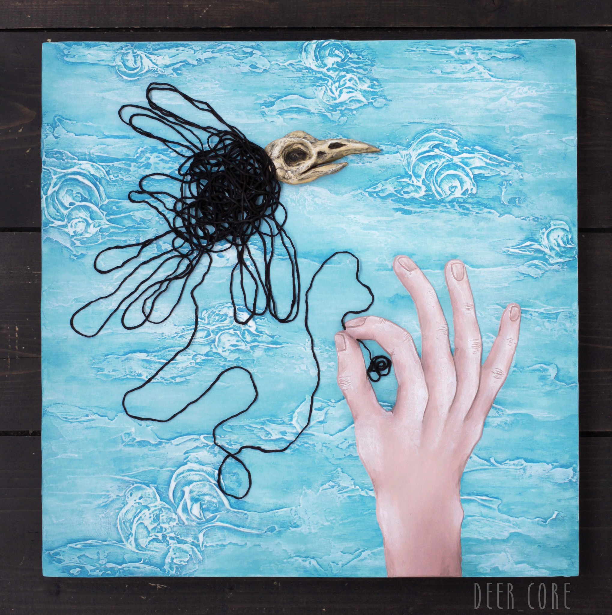 hardboard on wooden frame, modeling paste, yarn, air drying clay, acrylic paints